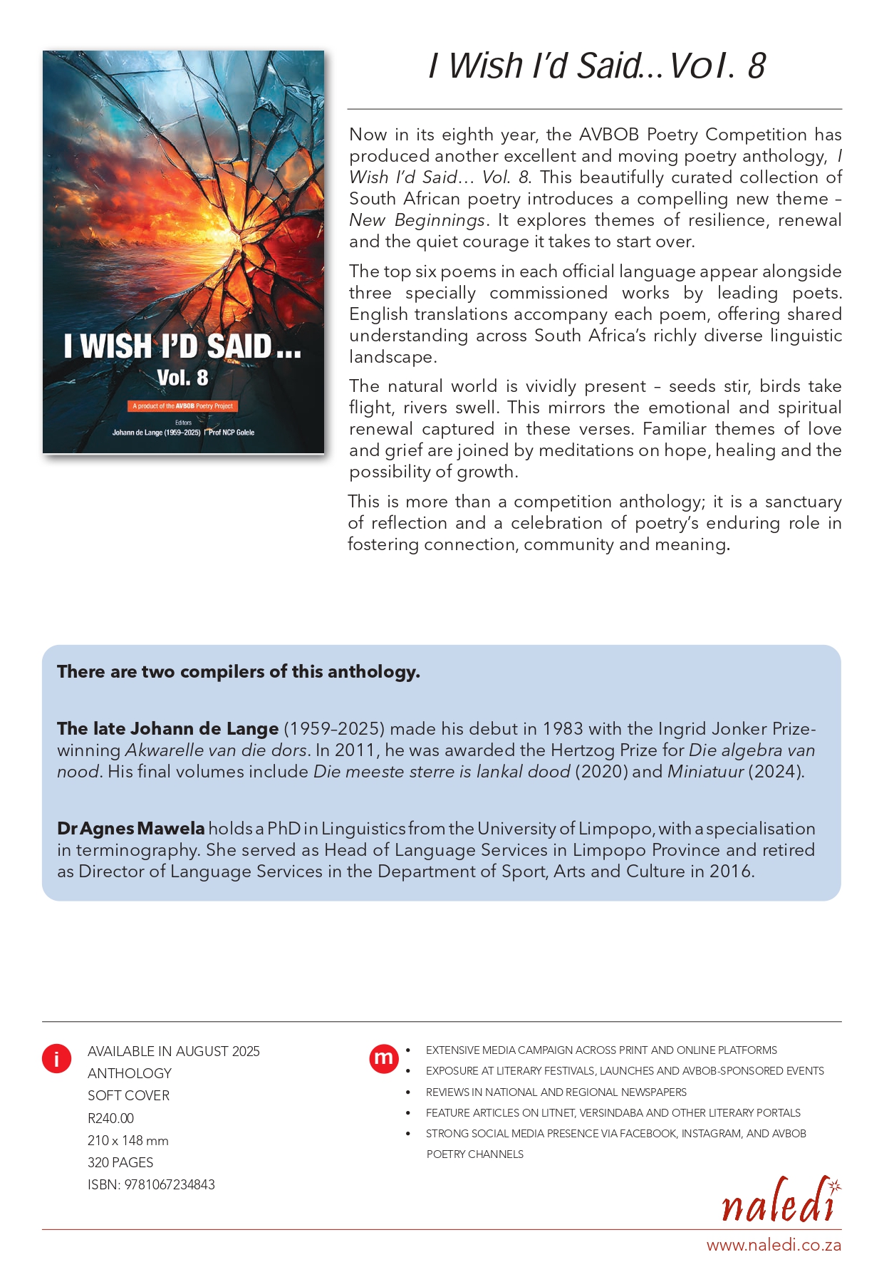 Order the highly collectible Volume 8 of I Wish I'd Said now. SMS the word 'POEM' to 48423 (at a standard cost of R1.50 per SMS) to have it posted to you at a total cost of R240. You can also order yours by e-mailing Tertia on tertia@naledi.co.za or find it on the shelves of most good book stores.