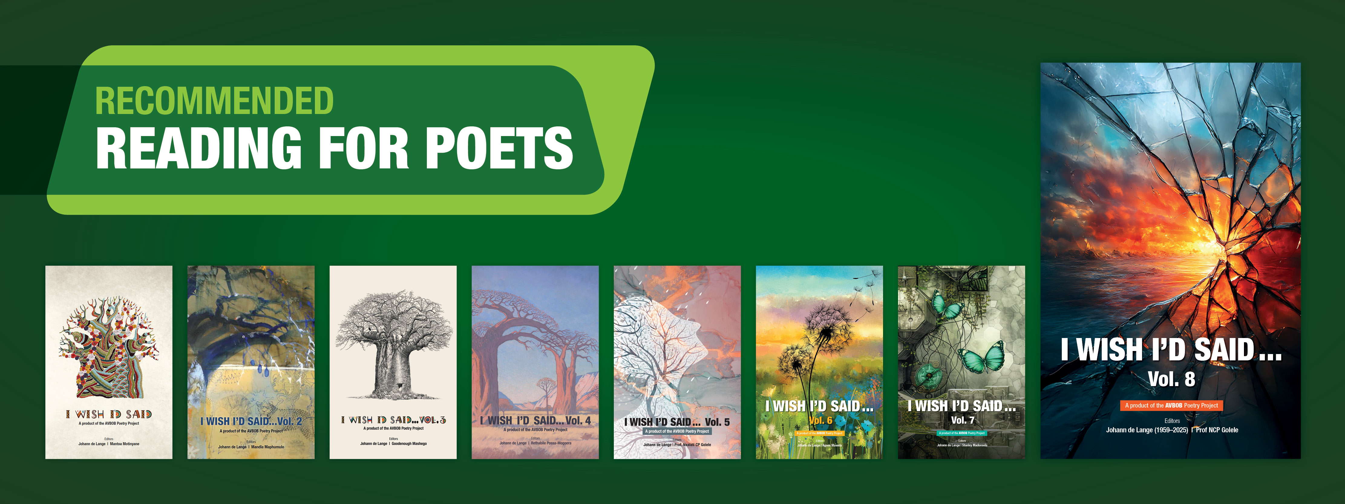 I Wish I'd Said, the print anthology that captures the essence of the annual AVBOB Poetry Competition, is available in eight collectible volumes, which, together, contain hundreds of original poems in all 11 of our mother tongues. What better way to learn to write a winning poem? It is through reading the works of other poets that we make our own journey from beginner… to master.